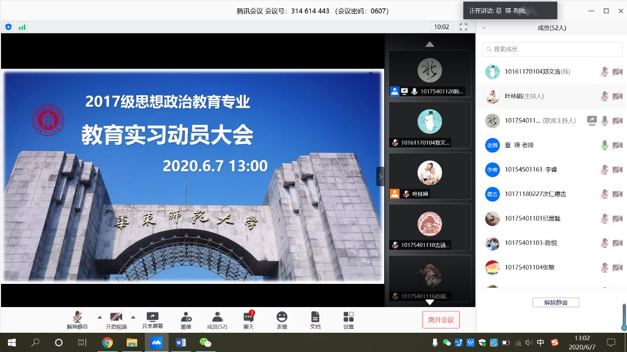 2017级思想政治教育专业实习动员大会于2020年6月7日下午13:00在腾讯会议线上顺利举行,365体育投注官网 副院长许瑞芳及章瑛、史俊、翟贤亮和叶林娟等老师参加,会议特别邀请了何静、李睿、朱诗妤三位学长学姐进行经验分享。