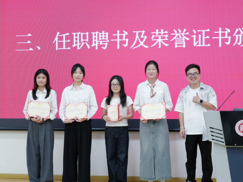 为表彰先进、激励奋进,解涛老师为第三届学生会主席团成员、各部门部长、团委副书记颁发聘书,并为优秀干事颁发荣誉证书。