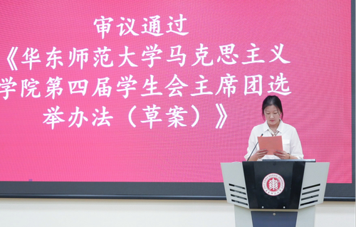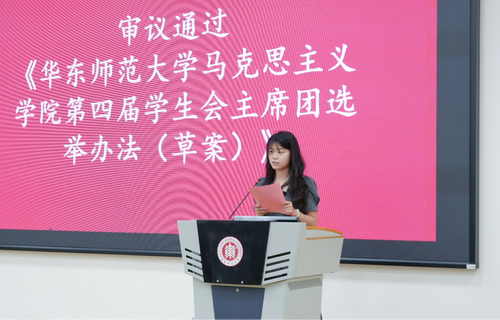 仝洋与赵紫瑶同学分别宣读《365体育-365体育投注官网 第四届学生会主席团选举办法(草案)》和《365体育-365体育投注官网 第四届学生会主席团选举监票人、唱票人、计票人名单(草案)》。经全体代表举手表决,两项草案均获全票通过。